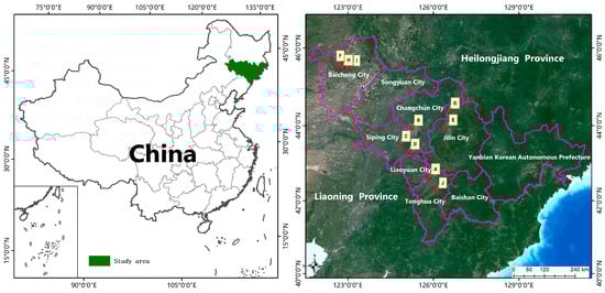 The samples were selected from the Rice Research Institute of Jilin Academy of Agricultural Sciences. Ji-Japonica 830 was selected in the experiment. JiB2008-1853 (Yunlangxiang) was used as the maternal parent, and Tongke 17 was used as the male parent. Ji-Japonica 830 belonged to the late-maturing variety with a growth period of about 144 days and a plant height of about 104.1 cm, which was affected by the growth environment. Ji-Japonica 830 varieties of rice from ten different regions were collected for research. The longitude, latitude, and soil type of the ten different regions were different, as shown in Figure 1 and Table 1, and the naming rules of the different regions are abbreviated by the name of the specific region where the rice is grown, for example, Dagushan, Siping City (DGS), laying a solid foundation for further research on rice growing in different geographical environments.