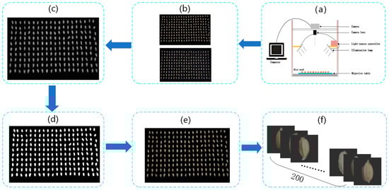 Schematic diagram of image acquisition and preprocessing process,(a) is the image capturing system, (b) is the front and back image of the original image, (c) is the grayscale image, (d) is the binary image, (e) is the original image with the background removed, and (f) is the segmented image.
