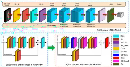The improvement process of the model is shown in Figure 5. Figure 5a represents the original structure of the ResNet50 model, Figure 5b represents the bottleneck of the ResNet50 model, and Figure 5c represents the bottleneck of the improved HResNet model, where ReLU and Mish are two different activation functions, BN is a batch normalization layer, Max pool maximum pooling, Avg pool is average pooling, Conv is an ordinary convolutional layer, GConv is a group convolution, DSConv is a depth separable convolution, Fc stands for fully connected layer, and SCEBlock is an improved module in this study.