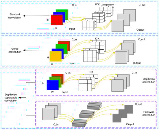 Through the decomposition of the convolution kernel and convolution process, separable convolution and group convolution have higher efficiency than standard convolution. This can greatly control the number of parameters and the calculation cost while improving the model performance (see Table 4). As shown in Figure 6, assume that the number of input and output channels are C_in and C_out, respectively, K2 is the kernel size of the convolution, G is the size of the group, and the size of the picture is H × W.
