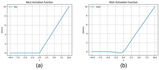 To enhance model convergence and smoothness during training, we incorporated the Mish activation function [] into the model, illustrated in Figure 5c. Compared to the ReLU activation function [], Mish offers several advantages. First, as depicted in Figure 7, Mish is smoother than ReLU, mitigating issues like gradient disappearance and explosion, thereby enhancing the stability and convergence speed of the neural network. Second, both Mish and ReLU have infinite upper bounds, allowing positive values to reach any height, thus circumventing saturation problems associated with capping. While ReLU tends to truncate at negative values, Mish exhibits a slight tolerance for negatives, promoting better gradient flow and alleviating the hard zero boundary problem in ReLU. Finally, owing to Mish’s smoothness, it facilitates deeper penetration of information into the neural network, thereby improving model accuracy and generalization.