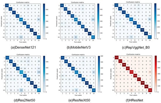To comprehensively assess the performance of the enhanced model on targeted tasks, authenticate its effectiveness and advancements, and benchmark it against established methodologies, we have devised a series of comparative experiments that aim to thoroughly evaluate the model’s robustness. Through this experiment, we compare the improved network model with five classical convolutional neural networks, namely, ResNeXt50, Res2Net50, RepVggNet_B0, MobileNetV3, and DenseNet121. The results are shown in Table 11 and Figure 9.