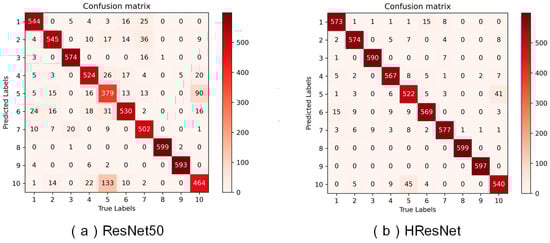 As illustrated in Figure 10, a comparison of the confusion matrices before and after the improvement reveals a substantial enhancement in the model’s performance. Specifically, examining the confusion matrix for HResNet, it is evident that the classification capabilities of the model have undergone a noticeable upgrade across all categories. Notably, the misclassification rate for DGS, which was previously a significant challenge, has been significantly reduced, enabling the model to more precisely identify samples belonging to this category. Furthermore, the diagonal values have undergone a marked improvement, resulting in a darker coloration that indicates a significant enhancement in the recognition rates across each category. Additionally, the overall clarity of the confusion matrix has been improved, resulting in a higher degree of differentiation between classes. In summary, the enhanced deep learning model exhibits superior performance in classification tasks, delivering more reliable and accurate classification outcomes for a range of related applications.