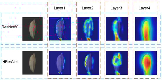 The visualizations generated by the Grad-CAM tool offer a more intuitive visualization of the interested regions within each layer of the feature map, comparing the model’s state before and after improvements. As depicted in Figure 13, although the Grad-CAM heatmap of the original model can localize regions in the rice images that contribute significantly to the classification outcomes during the rice origin tracing task, its precision and clarity in identifying activated regions remain inadequate. Prior to the enhancement, the Grad-CAM heatmap often struggled to pinpoint crucial information, thus limiting the accuracy of classification. However, with the advancement of the residual network, the new Grad-CAM heatmap has undergone significant improvements in terms of precision and feature representation. The refined model excels at extracting key features from rice images and mapping them onto heatmaps with unprecedented precision. On the heatmap, the crucial feature areas are clearly highlighted, with sharper boundaries that more accurately reflect the underlying feature information. Comparing the Grad-CAM heatmaps of each layer, both before and after the improvements, the enhanced model’s prowess in feature extraction becomes evident. Notably, the transition from Layer 4 reveals a shift in the model’s focus, from a preponderance on local features to a stronger emphasis on global features. This transformation not only augments the model’s tracing accuracy but also enhances its resilience against complex backgrounds and images with subtle features, providing a more robust technical backbone for the rice origin traceability task.