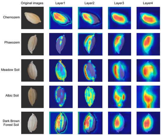 As depicted in Figure 16, rice images representing five distinct soil categories and their corresponding heatmaps through each layer of the HResNet model are exhibited. In the original images, features like color, texture, and shape are prominently displayed, serving as fundamental inputs for subsequent layers of processing. In the initial layer, HResNet initiates the extraction of original image features, encompassing edges, corners, and basic textures. The heatmap of this layer reveals that the model has already begun abstracting and extracting these original features. Differences in these original features among rice grown in various soil types start to manifest in this layer, establishing a solid foundation for more intricate feature extraction in subsequent layers. Moving to the second layer, the model delves deeper into extracting the subtler characteristics of the rice. In the third layer, the model proceeds to abstract and integrate original features, resulting in higher level feature representations. The heatmap of this layer illustrates that the model is now capable of distinguishing more intricate and specific attributes, such as the rice’s shape, color, and texture, which are crucial in differentiating rice grown in different soil conditions. Finally, in the fourth layer’s heatmap, the model has accomplished the comprehensive recognition and feature integration of rice from the five different origins. The color distribution and intensity on the heatmap reflect the model’s confidence and discriminatory ability to distinguish rice grown in diverse soils. It is evident that the model demonstrates a clear distinction between rice from different origins, underscoring its efficiency and precision in the task of origin tracing. Through the sequential processing of these four layers, the model transparently exhibits how it extracts, abstracts, and combines features from the raw image data, ultimately achieving the precise identification and classification of rice grown in diverse soil conditions. The heatmaps at each layer vividly illustrate the distinct stages and transformations undergone during the feature extraction and classification processes of HResNet, underscoring its impressive capabilities and effectiveness in the crucial task of origin tracing.