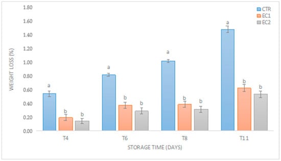 In terms of chemical properties, TSSs and TA showed evidence of slight changes during storage in the CTR, EC1, and EC2 samples. TSSs remained constant throughout the entire storage period. The first significant difference between the treatments (CTR, EC1, and EC2) was observed at the end of the storage period (T11 days at 5 °C). Indeed, the CTR samples showed a TSS loss of 21% from the beginning to the end of the cold storage period; instead, EC1 and EC2 showed TSS losses of 11% and 10%, respectively (Table 1). The EC1 and EC2 treatments slightly inhibited the decrease in TSS, acting as a barrier, as reported by previous research [,].