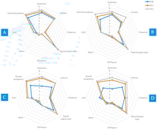 Sensorial analysis of loquat fruit control samples (CTR) and treated loquat fruit samples (EC1; EC2) immediately after treatment (A), after 4 days of cold storage (B), after 8 days of cold storage (C), and after 11 days of cold storage (D) at 5 ± 0.5 °C. Data are the mean ± S.E. (n = 5).