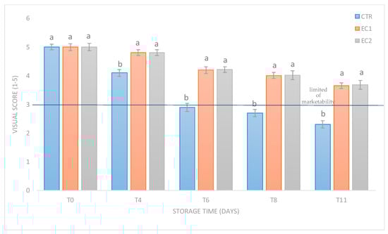 Visual score of loquat fruit control samples (CTR) and treated loquat fruit samples (EC1; EC2) at harvest and during cold storage (4, 6, 8, and 11 days at 5 ± 0.5 °C). Different lowercase letters indicate significant differences at p ≤ 0.05 between the treatments on each sampling date. Data are the mean ± S.E. (n = 5).