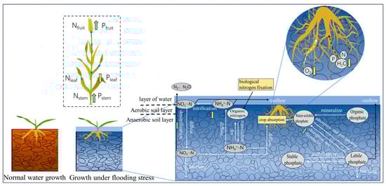 Waterlogging issues are closely associated with the temporal and geographical properties of precipitation. When precipitation exceeds the water requirement of wheat due to uneven distribution in both area and time, it can lead to field waterlogging and nutrient loss in the soil and water [9]. De-Campos et al. [10] conducted short-term waterlogging stress experiments on soils over a period of 14 days. They found that redox-sensitive substances (e.g., NO3−, Fe, and Mn) that can be stabilized under aerobic conditions are susceptible to reduction reactions during waterlogging stress and are released from the soil into the water. When Sánchez et al. [11] exposed a 1 kg weight of sandy clay soil to a prolonged waterlogging stress scenario for two months, they observed that the plants increased the rate of phosphorus release, resulting in a loss of 1.3 mg of phosphorus per mesocosm. The losses of Fe, NH4+, and DON were measured at 15 mg, 16 mg, and 28 mg per mesoscale, respectively. In the Taihu Lake Basin, Xu et al. [12] conducted multi-site field studies at different fertility stages of rice and discovered that the peak of pollution loading from the runoff occurred during the seedling stage. The characteristics of nutrient loss from wheat fields with surface runoff under varying rainfall intensities were investigated by Yan et al. [13]. The findings indicated that the main factors contributing to nitrogen and phosphorus loss were nitrate nitrogen and particulate phosphorus. The nutrient concentration peaked in the early stage of runoff, while the nutrient loss rate was highest during the middle and late stages of runoff. From a plant physiological perspective, much of the damage to crops caused by waterlogging can be attributed to restricted aerobic respiration in the root system, increased root and leaf senescence [14], and nutrient loss [15], which in turn inhibit crop growth and reduce grain yield [16]. Feng et al. found specific morphological and physiological adaptations in wheat following waterlogging stress, such as the development of aerated tissues and adventitious root growth [17]. Mendoza et al. found that waterlogging stress significantly reduced the root biomass of Lotus corniculatus at the seedling stage but increased the effective nitrogen and phosphorus content in the soil, thereby enhancing the nutrient supply to the waterlogged crops [18]. Crops can compensate for growth by absorbing more nitrogen or phosphorus [19]. According to Jiang et al. [20], waterlogging stress during winter wheat growth would lower root activity, making it harder for roots to absorb nutrients, decreasing the amount of dry matter accumulated in the wheat, altering the ratio of dry matter transported and distributed to different organs, and ultimately lowering wheat yield. Zhou Sumei et al. [21] demonstrated that waterlogging significantly increased the number of secondary roots of winter wheat at the seedling stage. In contrast, Ghobadi et al. [22] subjected various types of wheat to seedling waterlogging stress and discovered that the root growth of winter wheat was significantly inhibited by this stress.
