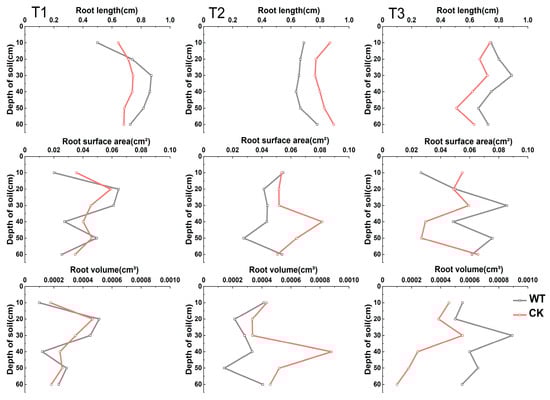 Distribution pattern of winter wheat seedling roots in different soil layers. T1 indicates that the micro-root tube is 0 cm away from the wheat row; T2 is 5 cm away from the wheat row; T3 is 10 cm away from the wheat row. CK: control treatment; WT: waterlogging treatment.
