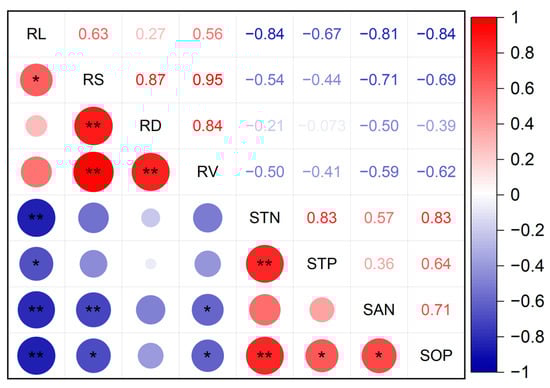 Correlation analysis between root morphology, soil nutrients, and runoff water quality. N (number of samples) = 132. Positive correlation effects are highlighted in red, while negative correlation effects are highlighted in blue. * indicates significance (* p < 0.05, ** p < 0.01). Abbreviated descriptions include root length (RL), root surface area (RS), root volume (RV), soil total nitrogen (STN), soil total phosphorus (STP), soil alkaline nitrogen (SAN), soil available phosphorus (SOP), water total nitrogen (WTN), water total phosphorus (WTP), water dissolved phosphorus (DTP), and water nitrate nitrogen (WNN).