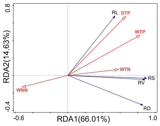 RDA ordination diagram of runoff water quality and winter wheat root morphology. Abbreviated descriptions include root length (RL), root surface area (RS), root volume (RV), root diameter (RD), water total nitrogen (WTN), water total phosphorus (WTP), water dissolved phosphorus (DTP), and water nitrate nitrogen (WNN).