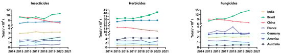 Usage of insecticides, herbicides and fungicides from 2015 to 2020 [2]. (Note: the data filtering was performed by entering the keyword “pesticide” in FAO, combining and selecting countries (e.g., China) + elements (Agricultural) + items (e.g., Insecticides + (Total)) + years (e.g., 2015)).