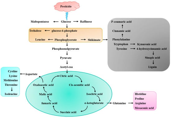 The growth of plants is related to various metabolites, and unfavorable stress conditions can lead to a decrease in the activity of several synthetic enzymes, including those responsible for synthesizing proteins, nucleic acids, lipids and carbohydrates. The activity of hydrolytic enzymes for proteins, nucleic acids, sugars and lipids increases with the intensification of stress. Long-term or severe stress can cause irreversible damage to plants [47]. To avoid such outcomes, plants resort to osmotic adjustment under stress conditions. The main osmoregulatory substances include soluble proteins, soluble sugars, proline, etc. The soluble protein content in rice tissues was significantly downregulated by 8.06% and 14.7% under the stress of 5.0 mg/L and 20 mg/L of endosulfan [15]. In lettuce exposed to 10 mg/L of IMD and fenvelarate, the levels of most amino acids in the roots were significantly reduced, and the content of flavonoid, an important active metabolite, in lettuce decreased by 25% after treatment with 10 mg/L of fenvalerate [14]. The effects of pesticides on plant metabolic substances are extensive and complex (Figure 2). During the defense process in plants, substances with osmoregulatory functions (such as sugars and proteins), secondary metabolites involved in scavenging ROS (flavonoids and phenolics), as well as the precursor amino acids required for their synthesis, are all affected to varying degrees.