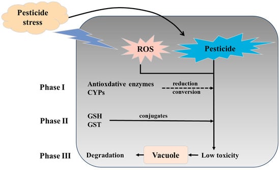 Pesticides have been observed to initiate the defense system of plants. The detoxification process employed by plants is elaborated upon, and is divided into three primary steps (Figure 3). Initially, plants leverage enzymes to hydrolyze or oxidize the toxic components in pesticides into intermediate products. These intermediate products are further metabolized by conjugation to an endogenous substance to form low-toxicity substances. Lastly, these conjugates are transported into vacuoles or apoplast for further degradation [77,78,79,80].