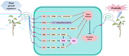 In addition to the detoxification factors previously discussed, nitric oxide (NO) regulates the stomatal opening and plant defense. This is achieved by controlling the overproduction of ROS via a modification in the activity of various ROS scavenging enzymes [95]. Furthermore, NO regulates mitogen-activated protein kinases (MAPKs) in response to ROS and hormones [96]. Moreover, assorted hormones including indole-3-acetic acid (IAA), salicylic acid (SA), jasmonic acid (JA), ethylene (ET) and abscisic acid (ABA) can stimulate the activation of the aforementioned factors [97]. The role of hormone-mediated defense pathways is significant and cannot be ignored, which has prompted scholars to study the resistance mechanism of hormones to pesticides.
