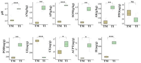 Comparison of soil physicochemical properties and enzyme activity between intercropping (TI) and monoculture (TM). AN: available nitrogen; AP: available phosphorus; AK: available potassium; SOM: organic matter; UE: urease; PPO: polyphenol oxidase; ACPT: acid phosphatase; CE: cellulase; POD: peroxidase; IE: sucrose. Asterisks indicate significant differences (* p < 0.05, ** p < 0.01, and *** p < 0.001, NS: no significant difference).