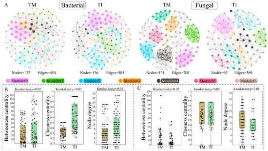 Soil microbial co-occurrence networks and their characteristics under different treatments. (A) Comparison of bacterial and fungal co-occurrence networks in soil under monoculture and intercropping systems in tea plantations. The networks were constructed based on the relative abundance correlation analysis among microbial genera. The color of each node corresponds to a specific microbial module. Connections between nodes indicate significant correlations, determined through a Spearman rank correlation test, with a significance level of p < 0.05 and a correlation coefficient greater than 0.70. Panels (B,C) depict the topological characteristics of the bacterial and fungal networks, respectively. These characteristics include Betweenness centrality, Closeness centrality, and Node degree.