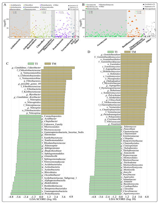 Classification characteristics of different bacterial taxa among the soil microbial communities under TI and TM treatments. The differential abundance of OTUs in the soil microbial communities under different treatments is displayed in Manhattan plots. Panels (A,B) depict enriched or depleted OTUs in the soil microbial communities of the samples. Each circle or triangle represents an OTU, with solid triangles indicating enrichment and empty triangles indicating depletion. OTUs with no significant change are represented by solid circles (p > 0.05). Panels (C,D) show the key differential bacterial (C) and fungal (D) genera in the microbial communities, with an LDA (linear discriminant analysis) score greater than 3.5.