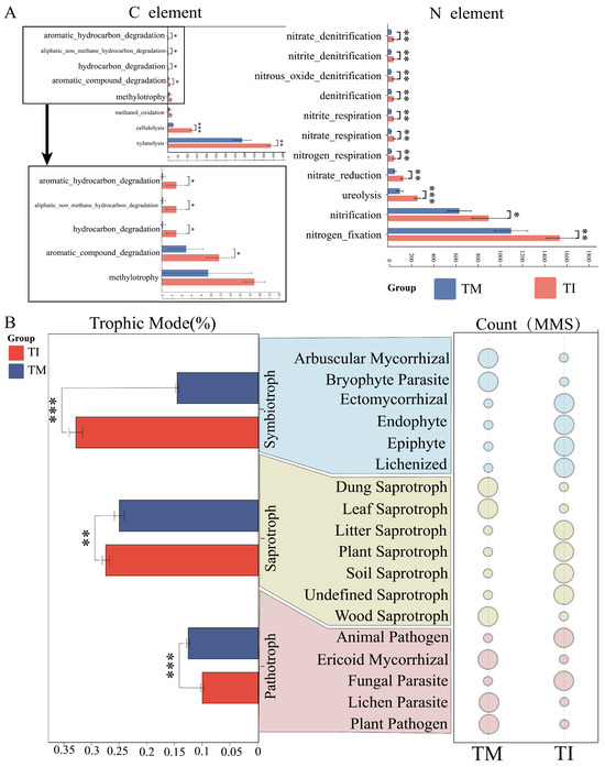 Functional prediction analyses of soil microbial communities under different treatments. (A) FAPROTAX analysis of bacterial communities; (B) FUNGuild analysis of fungal communities. In this context, the notation * denotes a significance level of p < 0.05, ** represents p < 0.01, and *** represents p < 0.001.