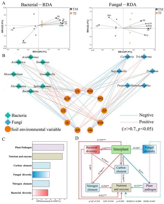 Using redundancy analysis (RDA), we demonstrated the influence of soil environmental variables on bacterial and fungal communities. Specifically, RDA1 and RDA2 collectively accounted for 96.7% of the variation in the bacterial community and 98.9% of the variation in the fungal community, as depicted in Figure 6A. Except for AN and AK, all other soil environmental variables exerted a significant impact on soil microbial communities. Notably, factors such as pH, CE, IE, ACPT, AP, and POD showed a significantly positive correlation with each other and exerted a more significant impact on the bacterial and fungal communities in the intercropping treatment. In contrast, the bacterial and fungal communities in monoculture soil were more influenced by UE and PPO.