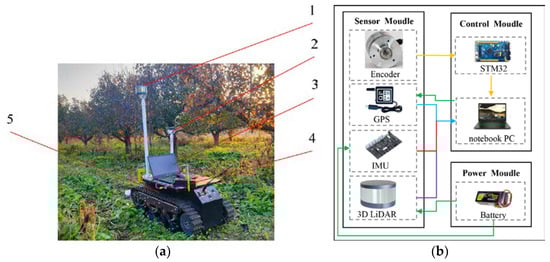 Composition and electronic hardware system of ICV. (a) ICV, and (b) Electronic hardware system design. 1. 3D LiDAR, 2. GPS, 3. Notebook PC, 4. Battery, 5. Chassis walking system. The green line in (b) indicates the power supply, while the others represent the information transmission.