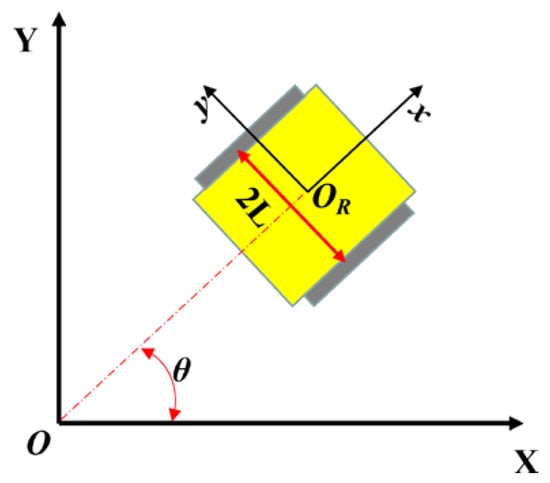 Kinematic model. Two coordinate systems are included in the figure, one is the world coordinate system and the other is the body coordinate system. The heading angle (), wheelbase (2L), and body center (OR) of the vehicle are also labeled in the figure.
