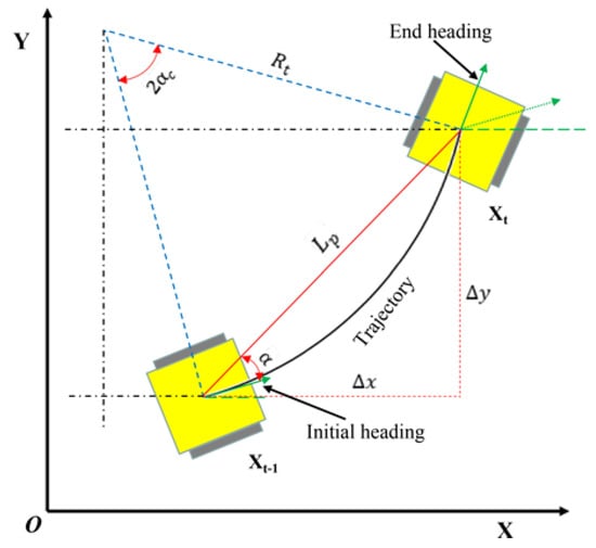 where, and are the X-axis and Y-axis displacements at the moment , respectively, and obtained by integrating the acceleration twice; is the heading angle; are the X-axis and Y-axis velocities at the moment , respectively, and obtained by integrating the acceleration; are the X-axis and Y-axis angular velocities at the moment , respectively, and obtained by integrating the acceleration, respectively; are the X-axis and Y-axis accelerations at the moment , respectively.