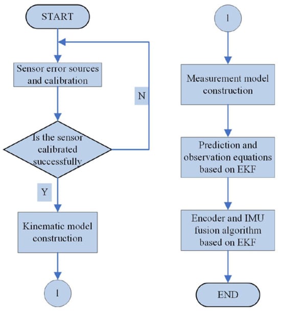 Multi-sensor fusion positioning needs to minimize the effect of sensor noise. The data from the encoder and IMU are fused, which are used to reduce errors and improve positioning accuracy. The encoder has high accuracy in measuring speed and determining displacement, whereas the IMU has high accuracy in angular velocity and acceleration measurement. Therefore, the measured data between the encoder and IMU can be complementary. In this study, the EKF algorithm is used to fuse the two measured data to realize the estimation, prediction and measurement of the real-time position of the ICV (Appendix B) [34]. The flowchart of the method C is shown in Figure 4.