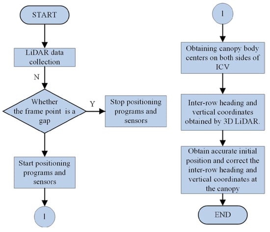 The relative positioning method has high positioning accuracy in a short time. There are gaps between canopies in some orchards and planted forests. According to the above characteristics, method D is designed (Figure 5). After the electronic hardware system is powered on, 3D LiDAR senses the surrounding information and processes it. It first determines whether the point cloud is a gap or not. If there is a gap, the IMU, encoder and the method C will stop. If there is a canopy, start. When restarting, the heading and inter-row vertical coordinates of the initial position are obtained (Figure 6). Additionally, the inter-row lateral coordinates of the initial position are 0. At the inter-row canopy, the heading and vertical coordinates are obtained by 3D LiDAR in real time. It can be corrected for the heading and vertical coordinates of the method C.