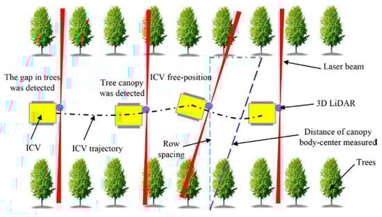 Principle diagram of method D. The laser beam detects tree canopies or gaps on both sides when the ICV is traveling between rows.