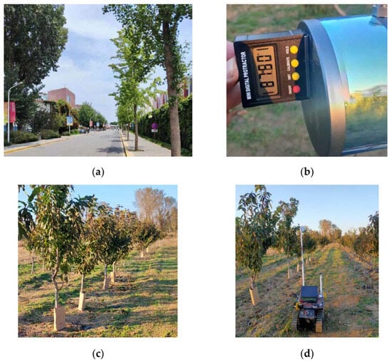 Situation of the experimental campus and orchard. (a) Ginkgo trees on both sides of the sidewalk; (b) 3D LiDAR installation angle correction; (c) experimental orchard situation; (d) experimental site. The figures include both campus and orchard experimental site conditions. The two topographies are obviously different.