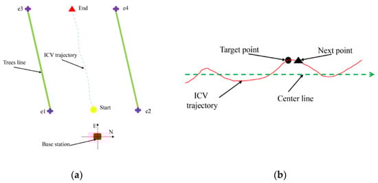 The heading angle of the ICV is obtained by real-time GPS trajectory and the center line of the tree row (Figure 8b), and the equation for the center line of the tree row can be obtained as follows: