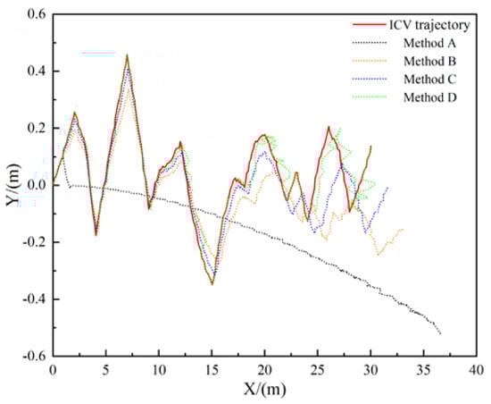 Trajectories of the ICV obtained by the four methods. The figure clearly illustrates the actual trajectory of the ICV and the measured trajectories of the four methods. The X-axis represents the inter-row lateral distance and the Y-axis represents the inter-row vertical distance.
