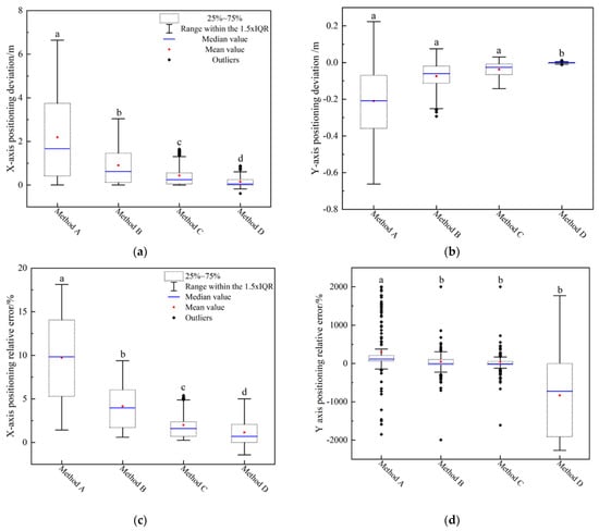 Given the variation of the measured positioning, the relative error (Equation (14)) can better represent the accuracy of the measured results.