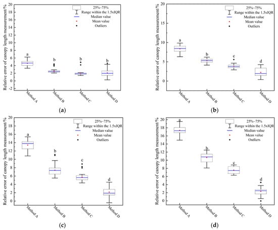 Duncan’s post-hoc test was performed on the measured results using SPSS one-way analysis of variance (ANOVA) with a significance level of 0.05. In all cases, Duncan‘s post-hoc test was used to compare the positioning deviation, positioning relative error and the average value of the maximum canopy length of the 4 positioning methods at the 0.05 significance level.