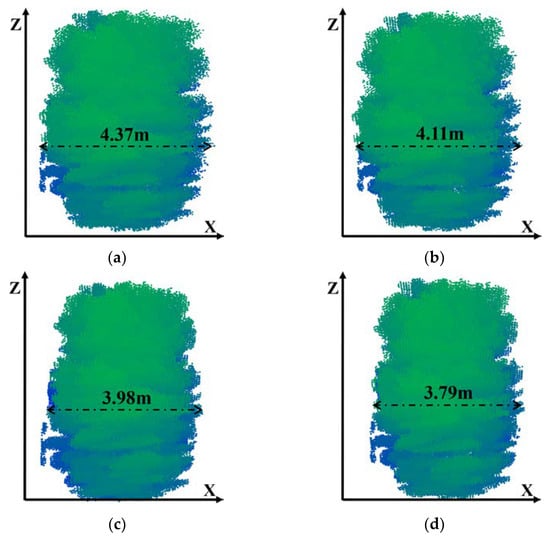 A meter ruler with an accuracy of ±1 cm was used to measure the maximum length of the canopy of each tree on both sides of the test area. The data were measured 5 times and recorded in a notebook. The maximum length of the canopy was obtained by 4 positioning methods and 3D LiDAR calculations. The acquired lengths were compared with the lengths obtained from manual measurements to obtain the relative error of the canopy maximum length measurements. The experiment was repeated 5 times. And the canopy point cloud of group 4 with significant errors was selected for analysis.