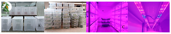 (A) CX.2385 plants isolated to obtain the CLR inoculum. (B) Inoculation boxes containing detached leaves inoculated with CLR. (C) Lighting conditions of the detached leaf evaluation room.