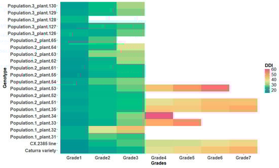 In population 2, there was also a variation in the reactions of resistance to CLR. Plants 52, 54, 55, 61, 62, 63, and 64 showed no development of a latency period (grade 4), similar to what we observed in plants 31 and 32 of population 1. Plants 51 and 53 had the highest incidence, which was similar to that of the CX.2385 line. Plant 65, which did not develop to a degree higher than 2, stood out (Figure 6).