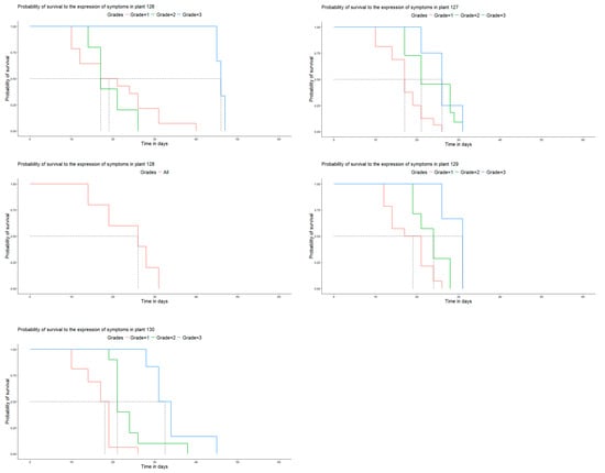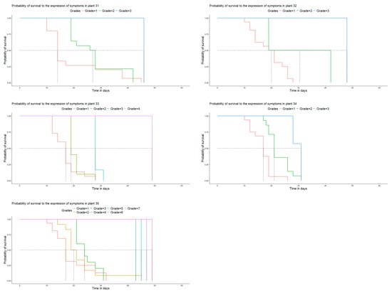 Days vs. probability of survival to CLR disease development in the genotypes of population 3 under laboratory conditions. Dashed lines: median number of days to reach each degree and median probability of survival.