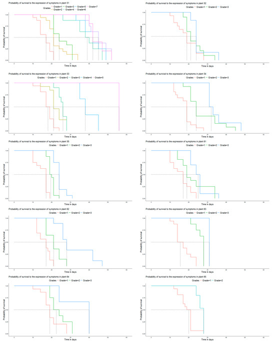 Days vs. probability of survival to disease development in the genotypes of population 1 under laboratory conditions. Dashed lines: median number of days to reach each degree and median probability of survival.