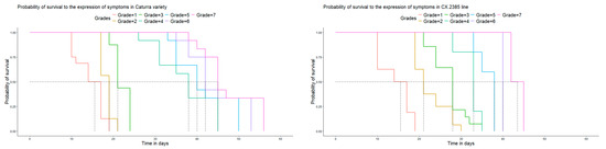 Days vs. probability of survival to CLR disease development in the genotypes of population 2 under laboratory conditions. Dashed lines: median number of days to reach each degree and median probability of survival.