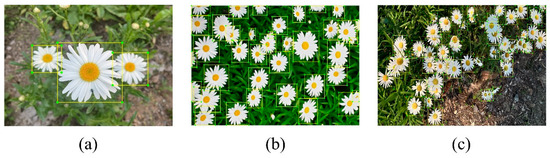 The flower density of the aforementioned three datasets varies significantly. Therefore, this paper categorizes them into different scenarios based on flower density to enhance the generalization capability of the model. As shown in Figure 1, according to the density of flowers, they are divided into three density levels: low-density, medium-density, and high-density. The division of flower density levels mainly refers to the severity of the obstruction between flowers. In the flower images, if there are only a few targets and no stacking or adhesion, it is classified as low-density. If there are more than 10 targets, and only some stacking and adhesion occur, and the area of obstruction between flowers is 10–30%, it is classified as medium-density; if there are many targets, and the stacking and adhesion between targets are severe, and the area of obstruction between flowers is more than 30%, it is classified as high-density. These images clearly show that compared with the scene of low-density flowers, the counting task in dense scenes is more challenging. The reasons include the adhesion between flowers, the obstruction of branches and leaves, the complexity of the background, and the scale changes of different targets, etc. These factors will affect the model’s ability to extract deep flower features, thereby reducing the recognition accuracy of the model. All details of the datasets can be seen in Table 1.