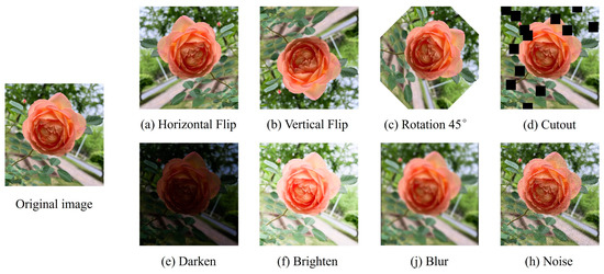 To avoid overfitting due to the scarcity and high similarity of sample data, this study employs a series of data augmentation operations on the original data. As shown in Figure 3, this study adopts data augmentation methods such as flipping, rotating, random cropping, brightness adjustment, blurring, and noise addition to process the flower images. These augmentation operations expand the volume of the training set to twice that of the original training set. A total of 5942 images, including augmented images and original images, are used in this study’s experiments. These images are divided into a training set (5286 images), a validation set (325 images), and a test set (331 images) at a ratio of 8:1:1. The test set only selects original images that have not undergone augmentation processing. The original images are more suitable for validating and explaining the performance of the model in this study, and for evaluating the detection effect of the model and the accuracy of flower counting.