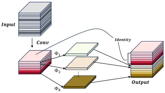 In convolutional neural networks, the redundancy of feature maps is considered an important characteristic of the network. In previous convolutional neural networks, after network feature extraction, many similar feature maps are generated. Moreover, for redundant feature maps, multiple convolution operations are often used to generate redundant feature maps one by one, which consumes a large amount of floating-point computation and parameters. The Ghost module generates more similar feature maps through linear transformation, avoiding the need to perform convolution operations on the redundant feature maps generated during the feature extraction process, thereby reducing computational cost and consumption. The Ghost module is shown in Figure 5.