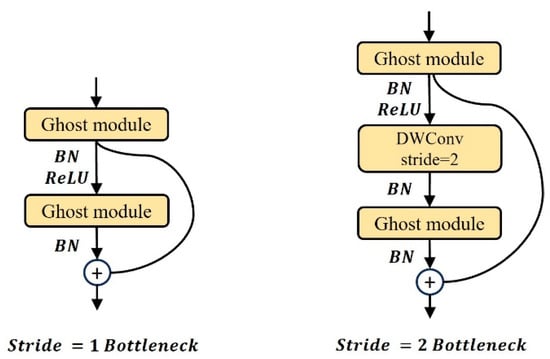 In GhostNet, the Ghost BottleNeck is composed of Ghost modules. Ghost BottleNeck employs a structure similar to the basic residual block in the Residual Network (ResNet) [32], as shown in Figure 6. When the stride is 1, Ghost BottleNeck continuously stacks two Ghost modules. The first Ghost module expands the number of channels, and the second Ghost module reduces the dimensionality of the features, reduces the number of channels, and performs feature matching. When the stride is 2, a depthwise separable convolution (Deptwise Conv) with a stride of 2 is added between the two Ghost modules to compress the size of the feature map. Finally, an add alignment operation is performed on the input features and the processed features to obtain the output result.