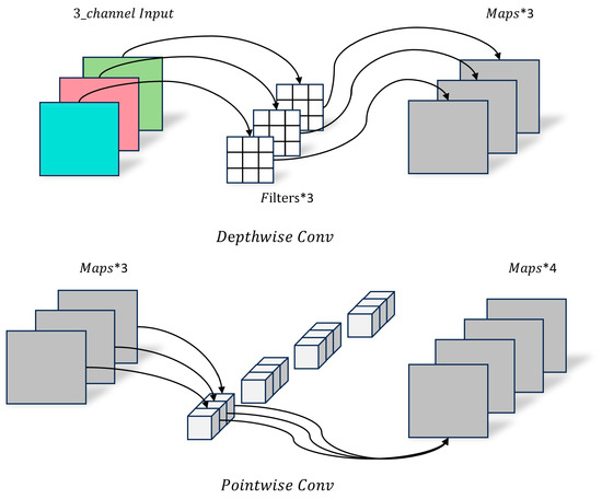 Depthwise separable convolution, as an important component of GhostNet, is characterized by dividing the complete convolution calculation into two steps, as shown in Figure 7. Therefore, it can be mainly divided into two parts: Depthwise Conv and Pointwise Conv. Depthwise primarily performs per-channel convolution operations on each channel of the input feature map, does not change the original number of channels, and does not share feature information. Pointwise is a 1 × 1 convolution layer, which can change the number of output channels and perform channel fusion operations on the feature map output by Depthwise Conv.