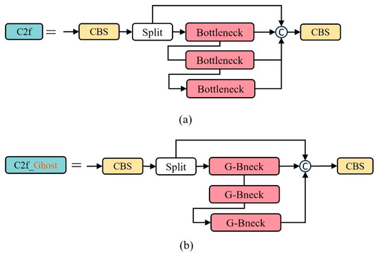 Therefore, this study utilizes the efficient GhostBottleNeck module to replace the BottleNeck module in the C2f module, constructing a new module, C2f_Ghost. This allows the model to maintain detection accuracy and speed while having less computational load. The C2f_Ghost module is shown in Figure 8.