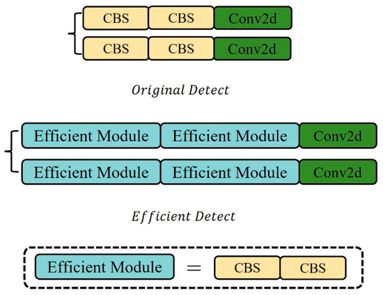 The improved efficient detection head still adopts the decoupled head structure and uses a parallel branch feature processing method. However, in each branch, two efficient modules are stacked to replace the two 3 × 3 convolution layers in the original detection head, and finally, the output is calculated by the standard convolution layer. The efficient module consists of two 3 × 3 convolution layers. Due to the small computational burden of 3 × 3 convolution, it can also enhance non-linearity, improving the model’s expressiveness for complex functions. Therefore, on the premise of slightly increasing the network computation, it can extract deeper and richer image features, retain more image spatial information, and thus significantly improve the model’s detection performance.
