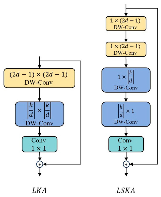 Large Kernel Attention (LSA) serves as the prototype for the LSKA [38] module, and its performance has been validated in the Visual Attention Network. This is shown in Figure 10. The innovation of LSKA lies in decomposing the 2D convolution kernel of the depthwise separable convolution into cascaded horizontal or vertical 1D kernels (, ), enabling it to adaptively capture long-range relationships. At the same time, it maintains a performance comparable to that before the improvement while consuming less computation and memory.